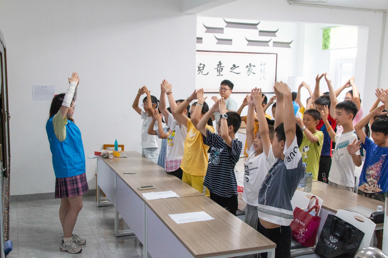 志愿者吕飞叶为三年级同学带来《感恩的心》手语课。她先介绍石羊塘镇儿童之家的由来,让孩子们知道现在拥有这么好的暑假学习条件,要感谢夏昭炎教授的无私奉献和政府的支持。“大家做得非常不错!‘有勇气做我自己’这句歌词的手语,就是将拳头举起放在胸前为自己加油。”她一边教动作,一边详细讲解其中的含义。通过简单易学的手势动作,将感恩情怀融入孩子内心。