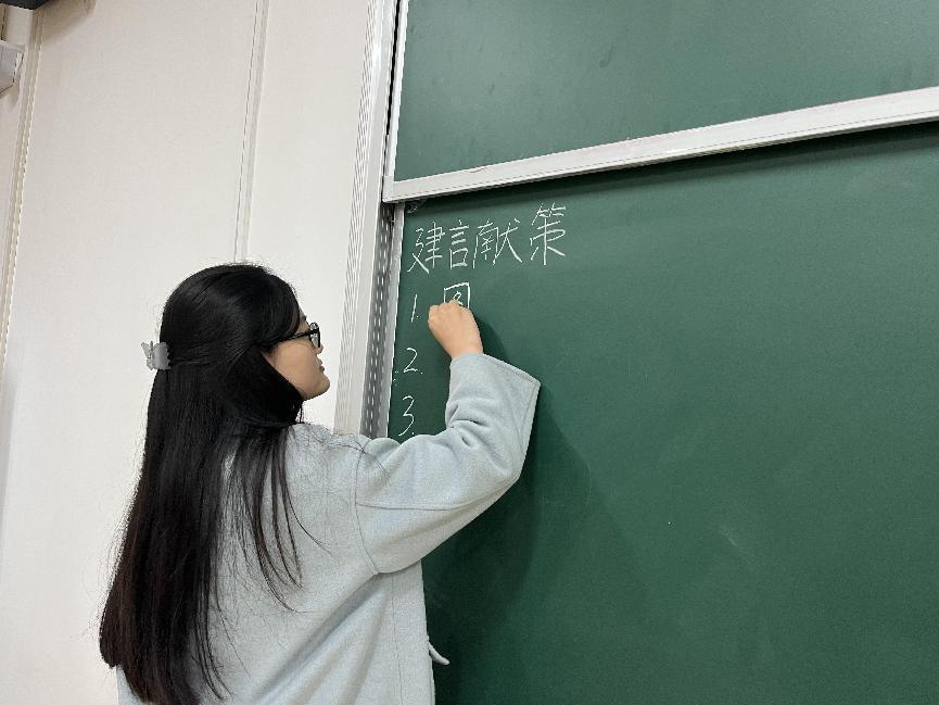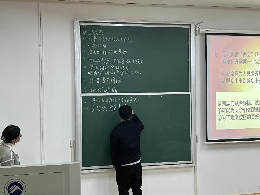 本次活动由研究生第三党支部书记戚路尧同志主持。活动开始前,戚路尧热情地向各位党员进行提问,并在互动的过程中介绍了前不久召开的全国“两会”的基本知识,现场气氛活跃。随后,戚路尧带领第三党支部全体党员认真学习了习近平总书记在“两会”上的重要讲话,并借助图解的形式回顾了《2023年国务院政府工作报告》。在讲解中,戚路尧将党的方针政策和理论知识与研究生的学习、就业等联系起来,贴近实际、易于理解。她强调,作为研究生党员,要了解时事政治,强化使命担当,践行党员的责任和义务。最后,戚路尧邀请各位党员为提升为同学服务水平、推动昭潭书院校区发展建言献策。第三党支部的党员同志们纷纷响应,提出了“多组织党员志愿活动”“为同学解答入党流程”等10余条建议。