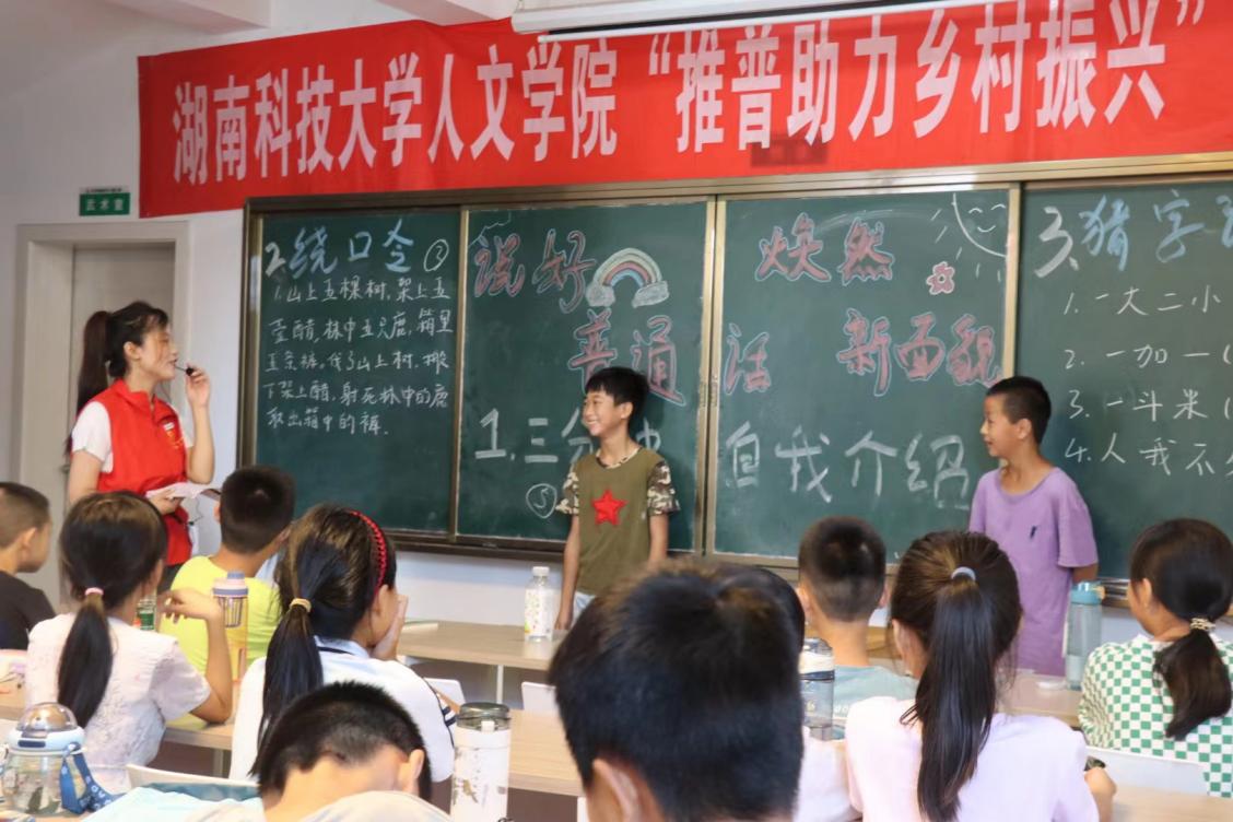 7月9日上午,株洲攸县石羊塘镇儿童之家传来了一阵又一阵的鼓掌声,四年级孩子们的欢笑声此起彼伏地传来。走进教室一看,是志愿者龙杨慧在教孩子们读绕口令。“发扬国风,从说中国话起;说中国话,从普通话开始。”为了圆满完成推普助力乡村振兴的志愿服务目标,在乡村大力推广普通话,传承优秀传统文化,为此8xbet体育8xbet体育“三下乡”实践团队在暑期学校展开三下乡特别课堂第三期:说好普通话,焕然新面貌。
