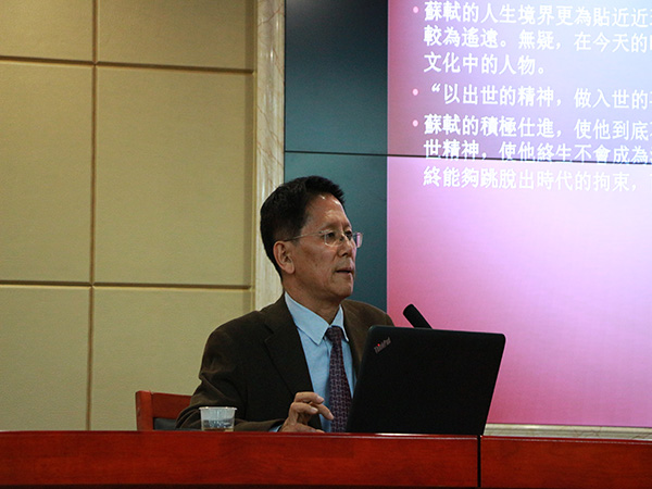 讲座伊始,木斋教授表示将从三个方面展开讲座内容:苏轼的神奇人生与审美人生、读懂东坡诗、读懂东坡词。在苏东坡的审美人生方面,木斋先生认为,苏轼提供了如何使儒家的进取和佛家的退避批判地结合统一的范例,提供了比归隐更高一层次的批判现实的道路。后来文人的思想脉络,都是东坡思想及人生道路的继承和发展。木斋先生分别从四个方面进行归纳,一是苏轼的出世精神和入世的事业;二是黄州、惠州、儋州这三个地方所代表的人生阶段的苦难造就了苏轼;三是苏轼之诗是助人走出人生迷雾的一支魔杖,能让人从中体会到其健康的人生哲学;四是东坡的性格和人生态度可概括为野性,是精神上的天人合一。“功利是人类最为原始的阶段,而审美是人类的终极境界”,他强调,“重新学习审美人生在当代有重要的意义,能在喧嚣的人生中寻找人生方式。”