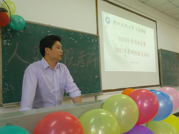 交流会现场,罗振军老师对我院2017年考研情况作了总结:我院13届共447名毕业生,我院178名考研人中共有104名考上研究生,踏上了硕士研究生学习的征程。罗振军主任对各专业考研录取率作了报告,并指出:“考研能帮助学生到另一个环境去深造,为学生提供一个更好的发展空间。”
