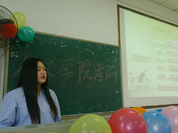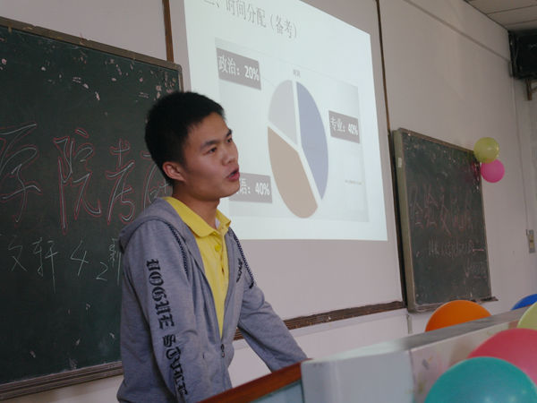 本次大会,七位在考研中成绩优异的13届的考研人分享了他们的心得经验。考取北京大学的13级思政专业徐冠宇学长抛出了橄榄枝,他一出现,场下就响起了一阵掌声。作为考研学子中的佼佼者,他自己的考研历程分享出来。他认为,考研中自制力很重要,考研期间,他每日六点之前起床,周末在七点半前便起床,与考研争分夺秒。在选学校上,徐冠宇认为报学校要量体裁衣,根据自己的情况,咨询学长学姐和老师,做出正确的判断和选择。他还向大家推荐如“考研网”、“学生精灵”等对考研有帮助的公众号,希望能够帮助到更多人。被郑州大学录取的13新闻专业的陈瑶在分享经验时强调:“考研是一个人的征途,应当给自己创造适合学习特点的学习环境,在制定复习规划时要严格要求自己。克服影响因素,有一颗坚持的心,”她在准备英语复习时,将考纲单词过了三遍,每天背单词,做阅读题。“考研是孤独漫长的心理战,是对自我的挑战。”她说。