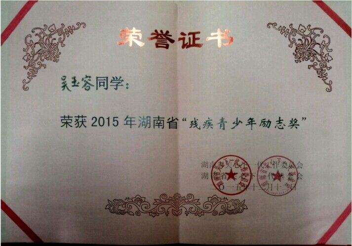 如今的她,已经是一名预备党员,近三年来,吴玉容获得了湖南省普通高校三好学生、湖南省残疾青少年励志奖、8xbet体育优秀记者、8xbet体育优秀共青团员等奖励。此外,吴玉容还拿到了英语四六级、三级心理咨询师、普通话二级甲等、国家计算机二级等证书。目前已与合作团队成功申请了省级科研项目,同时也被学院推优参加2017年度寻访“中国大学生自强之星”活动。