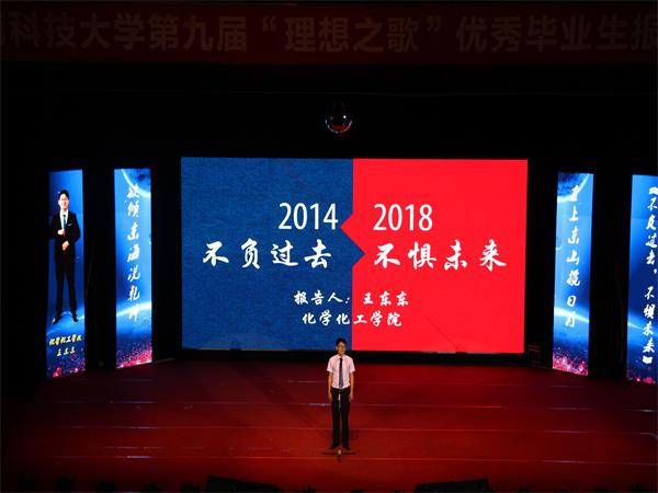 化学化工学院的王东东,一上台,就分享了一个故事。一个正打算半夜翻学校围墙去网吧玩游戏男生,却看到来送生活费却舍不得住旅馆而因此在墙角休息的父亲,自此发奋努力,成功逆袭。在大一沉迷各种游戏的他,认为大学四年那么长,挥霍一下也无妨,在看到这个故事后,深感惭愧,幡然醒悟。他认为只有不负过去,不惧未来,才是最好的方式。与科研的好奇与兴趣同行,他曾整日浸泡在实验室,曾见过凌晨三点半的科大,曾为国际专项赛苦练英语……他相信余生漫长,不必慌张,认真踏实做好每一件事,一定能等到岁月的回馈。