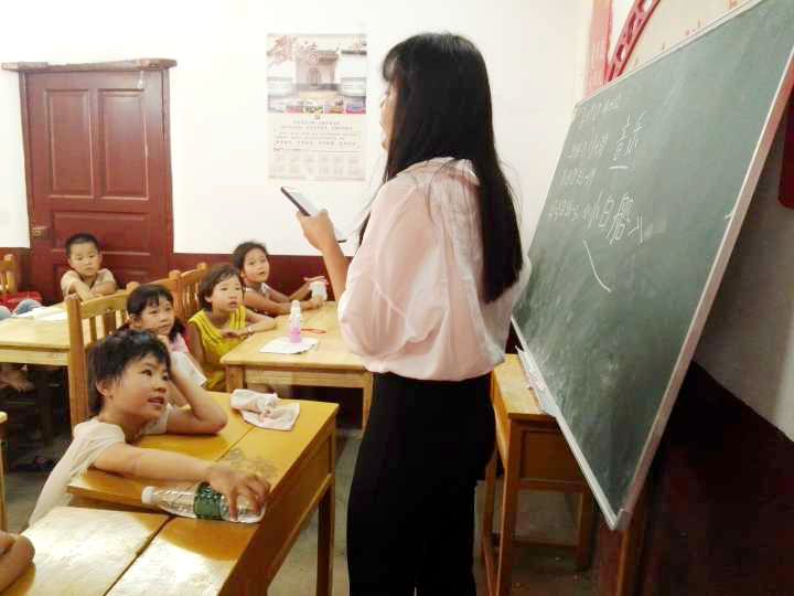 六六三十六、六七四十二、六八四十八……清脆的童声和着拍桌子“咚咚咚”的节奏声传出教室外。22日上午,小学一年级教室里,小朋友们坐的堂堂正正,在志愿者唐亚妮的带领下高声诵读九九乘法表。这种依据节奏记忆顺口溜的方法是我院志愿者在备课期间琢磨出来的,“小朋友们记忆力好,但可能难以集中注意力,通过这种方法既可以吸引孩子们的注意力,又能让他们在乐趣中学到知识。”授之以鱼不如授之以渔,唐亚妮在黑板上画出连续几排图形,并空下几个,让小朋友们找规律填几何图形,在几分钟安静的思考后,教室又重新“热闹”起来,小朋友争先上黑板展示自己的答案,唯恐老师不点自己去写,还站起来把手举的高高的招呼自己的小老师:“老师,老师,我知道,我要上去写。”孩子们在教室听的认真,教室外家长连连点头赞许,烈日灼灼,挡不住的是志愿者们的热情与担当。临近下课,唐亚妮敲敲黑板,给大家留了一道家庭作业:987654321=100,其中填入3个“+”和1个“--”使等式成立。这个趣味题立刻又引起了孩子们的积极动脑,围在桌子旁热烈的讨论了起来。