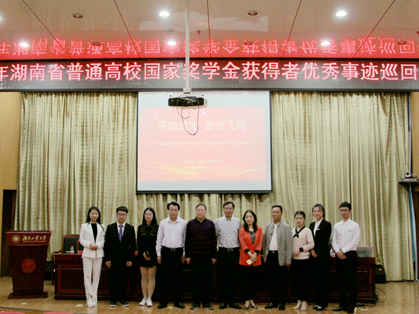 5月21日,湖南省普通高校“资助成才,助我飞翔”国家奖学金获得者优秀事迹巡回报告会第三场于湖南工业大学崇德楼一楼报告厅举行。湖南省学生资助管理中心副主任杨昌江,湖南工业大学党委委员、副校长李可兴,湖南铁路科技职业技术学院副院长陈彬,湖南省学生资助管理中心主任科员谭莉等出席会议。8xbet体育由8xbet体育赵华老师带队代表学校与会。