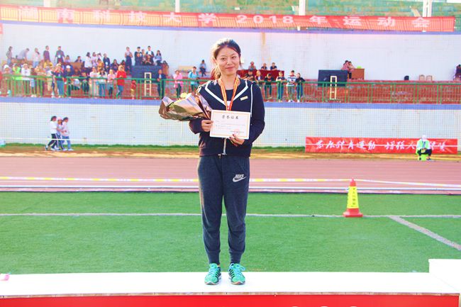这已经是她第三次参加运动会了,从第一年女子100米短跑的亚军,第二年的屈居第四,到今年的再次夺亚,她一次次向我们展现了她的不凡实力。可谁又能知道,在比赛的前一个星期她还在发烧,身体上的伤痛,并没有打败她。为了这次比赛她天天吃药,只望病能早点好,并天天与三个学妹训练,希望她们能发挥最好的水平。苍天不负有心人,她的病没有影响比赛,她的成绩也没有让自己失望。