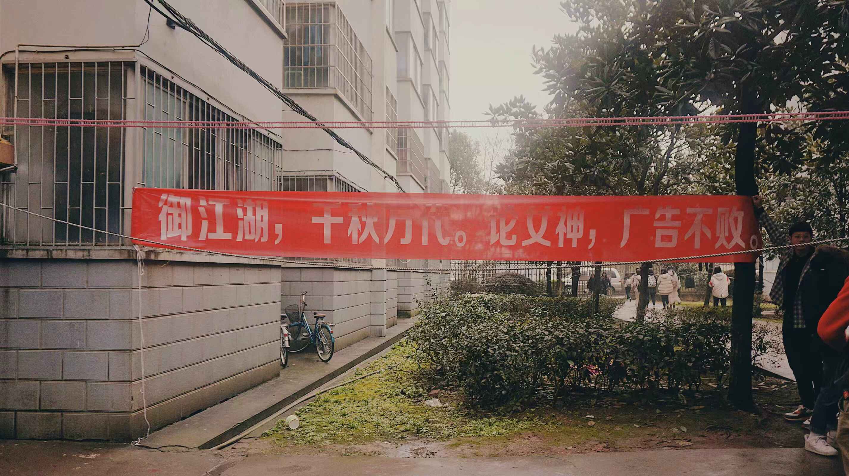 我院18级广告专业的男生早早就等在女生宿舍门口,天还有点黑蒙蒙的,但挂在树两旁的横幅却能让脑子立刻从混沌到清醒。“御江湖,千秋万代。论女神,广告不败。”男生们站在横幅前面成两排,为今天节日的主角精心准备了早餐,还细心的把牛奶也热好了,为这个还不算太温暖的初春添上几分明媚。