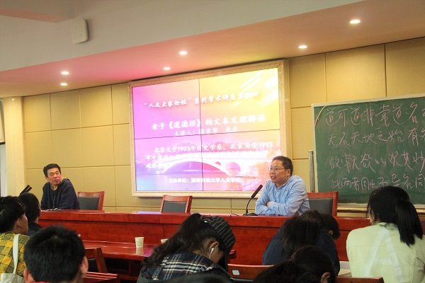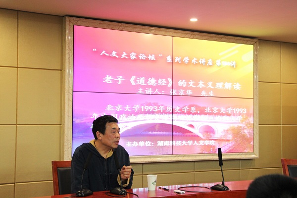 4月17日晚,湖南科技学院张京华教授应邀前来我校8xbet体育做了一堂题为“老子《道德经》的文本义理解读”的精彩学术报告。本次讲座由我院党委书记廖加林教授主持,我院吴广平教授、王友胜教授、张晚林教授、颜中军、胡忆红、余霞、胡红梅、龚超等老师及文、史、哲等专业的100多为本科生、硕士研究生到场聆听。