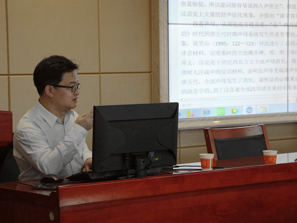 讲座在热烈的掌声中正式开始。朱冠明教授从语言功能和语义结构两个部分展开,并从“是”到哪里去了、“這”从哪里来的、“這”的字源和语源几个方面详细地介绍了近指代词“這”的来源,且分析了“是”和“這”的历史源流关系。朱教授认为,近指代词“這”字源于“是”字,“是”字从先秦到魏晋南北朝都是常见的指代词,从唐代开始,人们就放弃了对“是”的偏好,而“這”这个指代词也从此登上历史舞台。而关于“這”是哪来的,朱教授指出,“這”早期是在北方使用的,较早的用例出现在中唐时期。