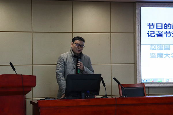 12月20日下午,我院“人文大家论坛”系列学术讲座第201讲在立言楼B4-1举行,暨南大学新闻与传播学院教授、博士生导师赵建国应邀作了以“节日的政治:民国时期九一记者节述论”为题的学术讲座。讲座由院党委书记李胜清教授主持,新闻与传播学系师生到场聆听。